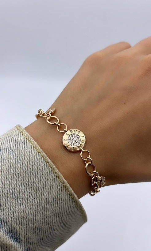 این دستبند با طراحی دایرهای و حروف «LOVE» در اطراف نگینهای درخشان، نماد عشق و زیبایی است.
