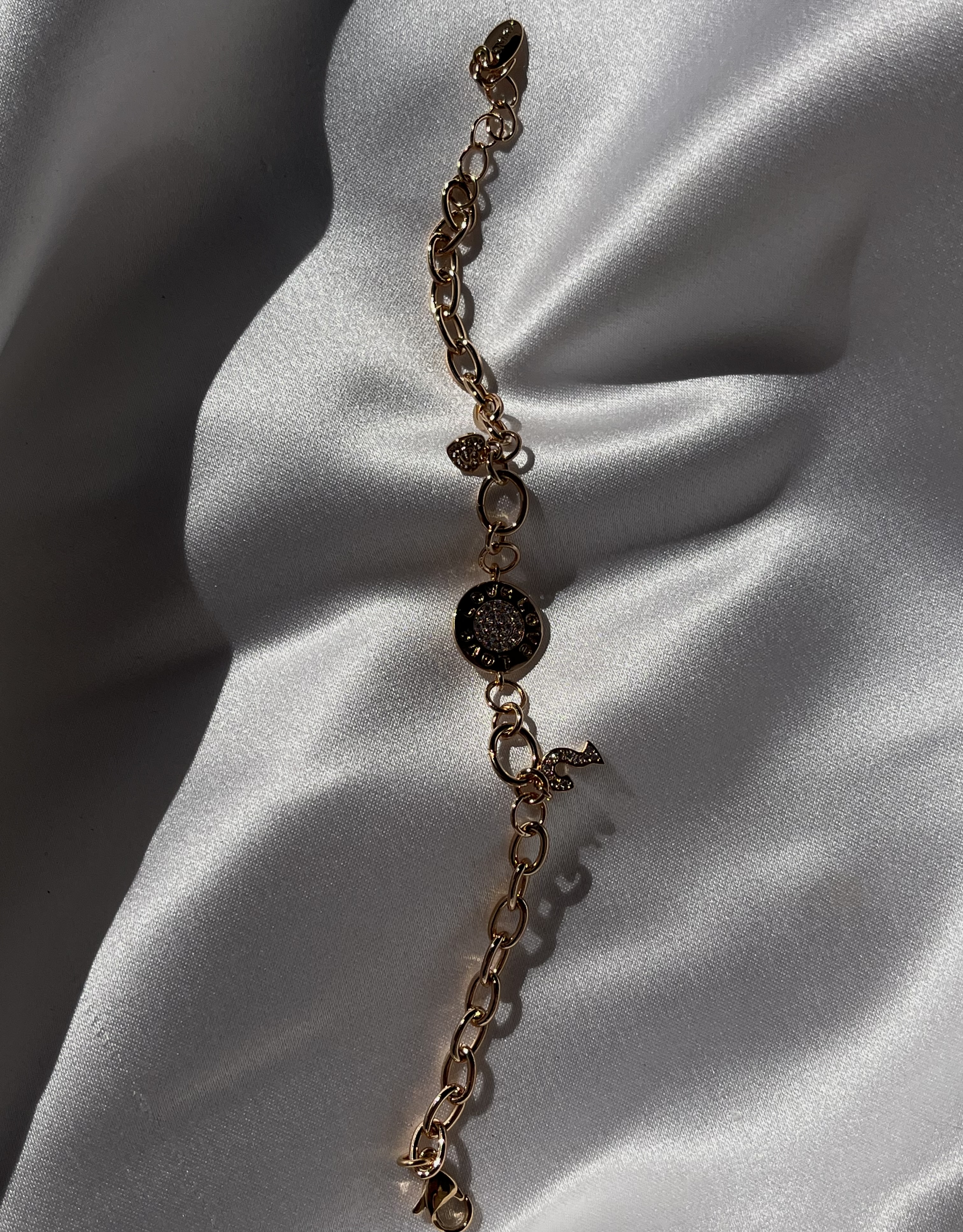 این دستبند با طراحی دایرهای و حروف «LOVE» در اطراف نگینهای درخشان، نماد عشق و زیبایی است.