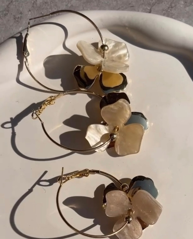 گوشواره حلقهای گلدار با طراحی خاص و ترکیب رنگ طلایی و صدفی، انتخابی لوکس و ظریف برای استایل روزمره یا مجلسی است. سبک، ضد حساسیت و ساختهشده از استیل باکیفیت و آبکاری طلا.
