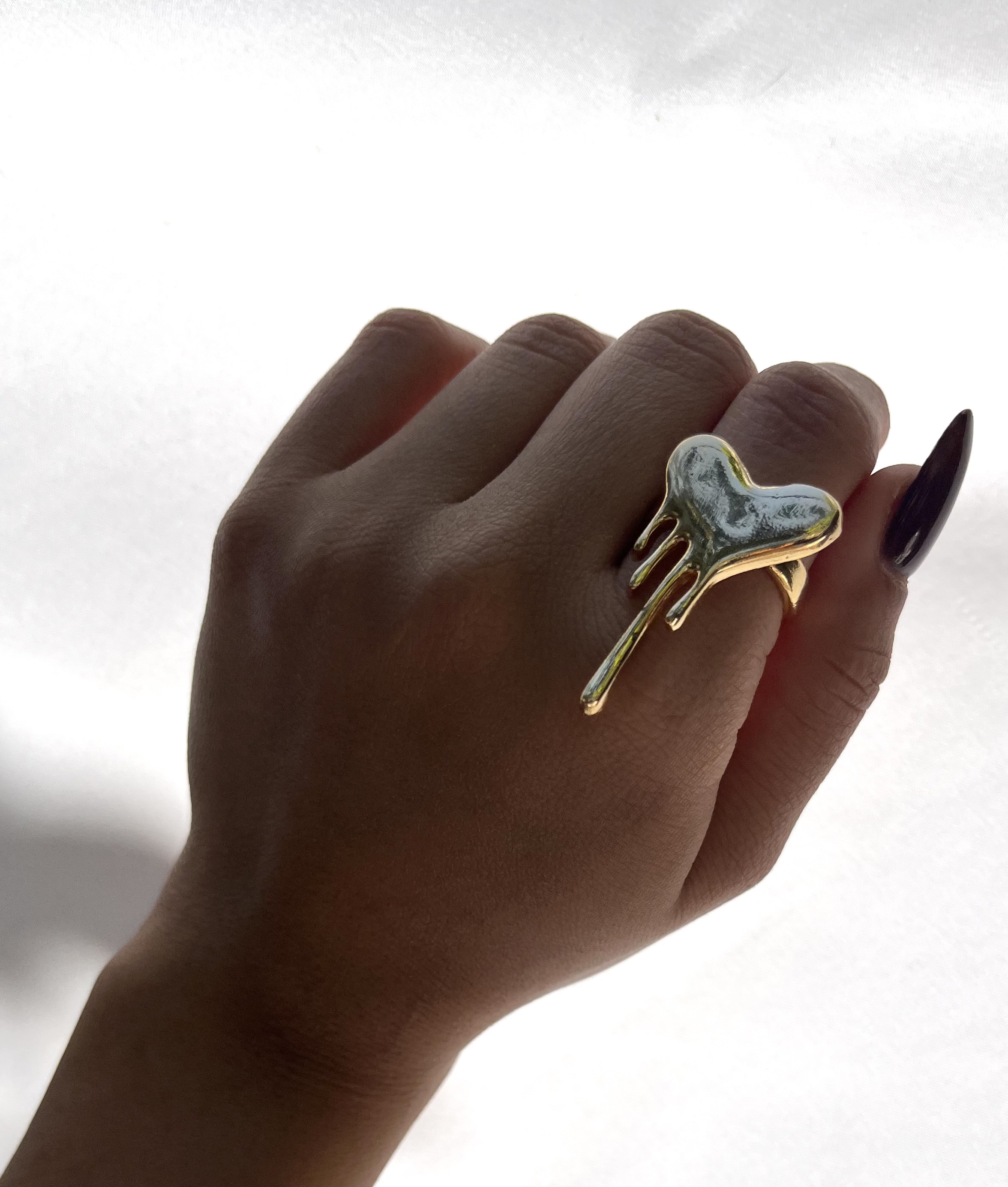 قلب آبشده و فرم نرم و روان این انگشتر، حس لطافت، عشق و خاصبودن را همزمان منتقل میکند. ترکیب فلز طلایی درخشان با طراحی خاص جلوهای مدرن و لوکس ایجاد کرده که بهراحتی با هر استایلی هماهنگ میشود