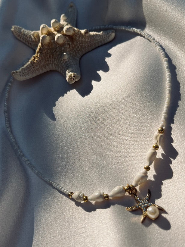 گردنبند صدفی 🐚🤍دخترانه با آویز ستاره دریایی طلایی، یک اکسسوری جذاب و خاص با حال و هوای تابستانی و ساحلی است. ترکیب صدفهای طبیعی، مروارید ریز و مهرههای طلایی جلوهای شیک و لطیف به این گردنبند میدهد و آن را برای استایلهای روزمره، ساحلی، مینیمال و فانتزی به انتخابی ایدهآل تبدیل میکند.