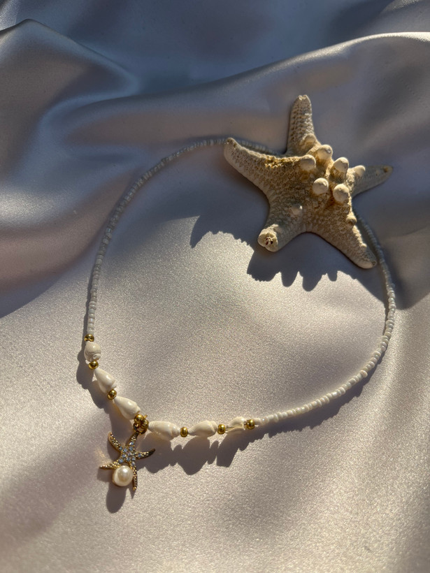 آویز ستاره دریایی که با نگینهای درخشان تزیین شده، نقطهی تمرکز زیبایی این محصول است و آن را بسیار چشمنواز کرده است.
